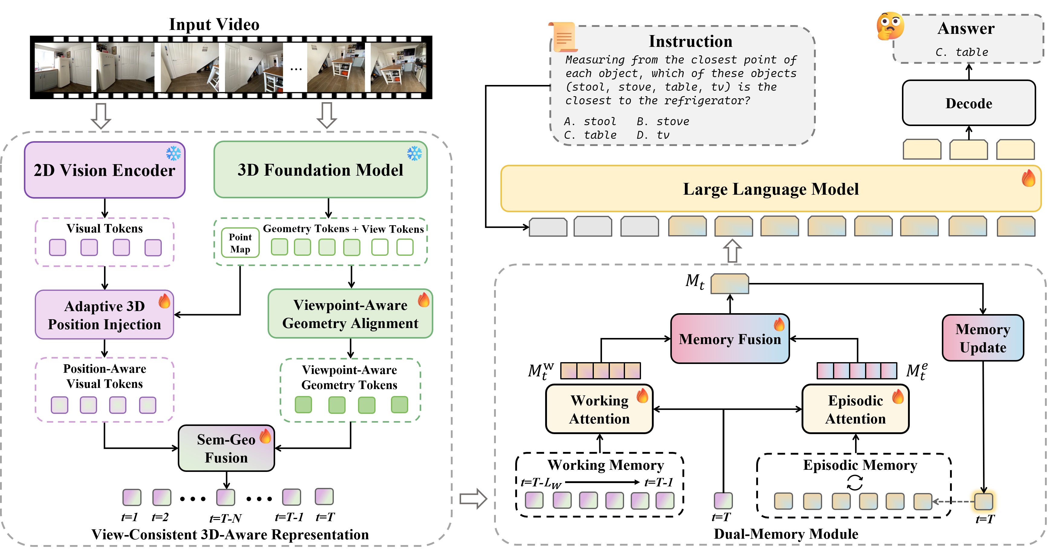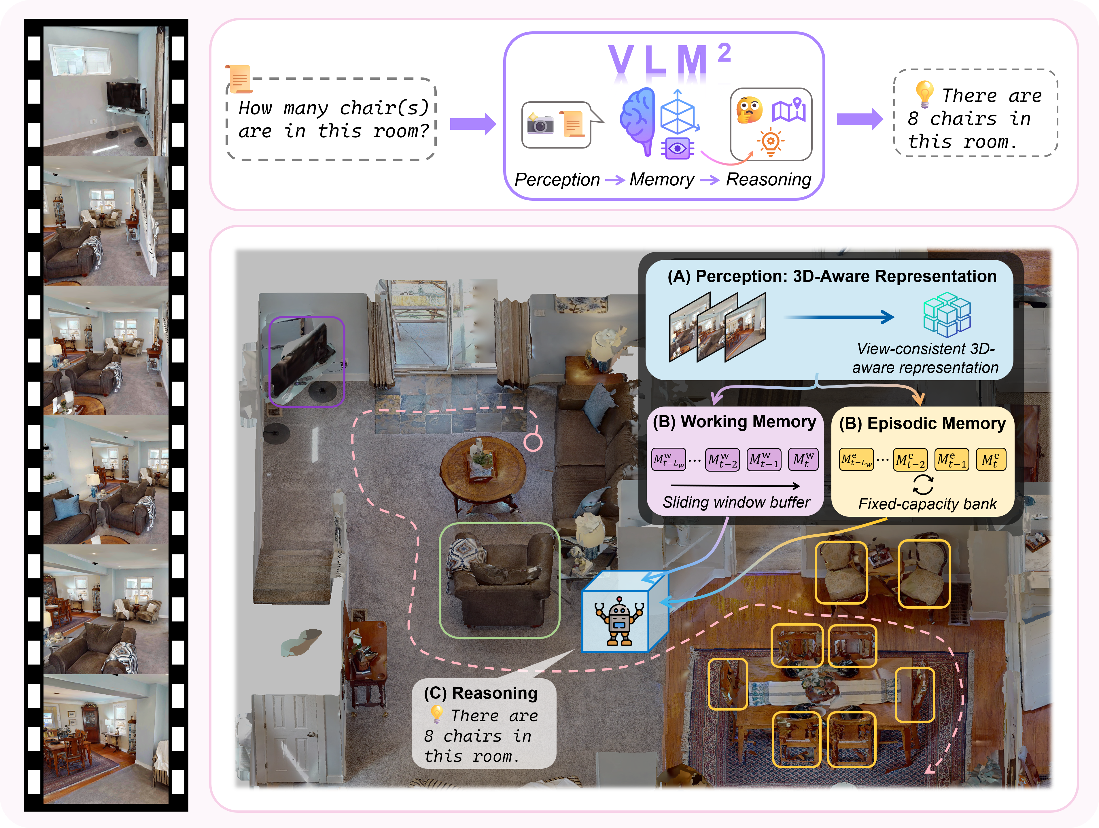 VLM2 constructs a view-consistent 3D-aware representation via adaptive 3D position injection, viewpoint-aware geometry alignment and semantic-geometric fusion. A dual-memory module with a sliding-window working memory and a fixed-capacity episodic memory maintains these representations over time, supporting long-horizon spatial reasoning.